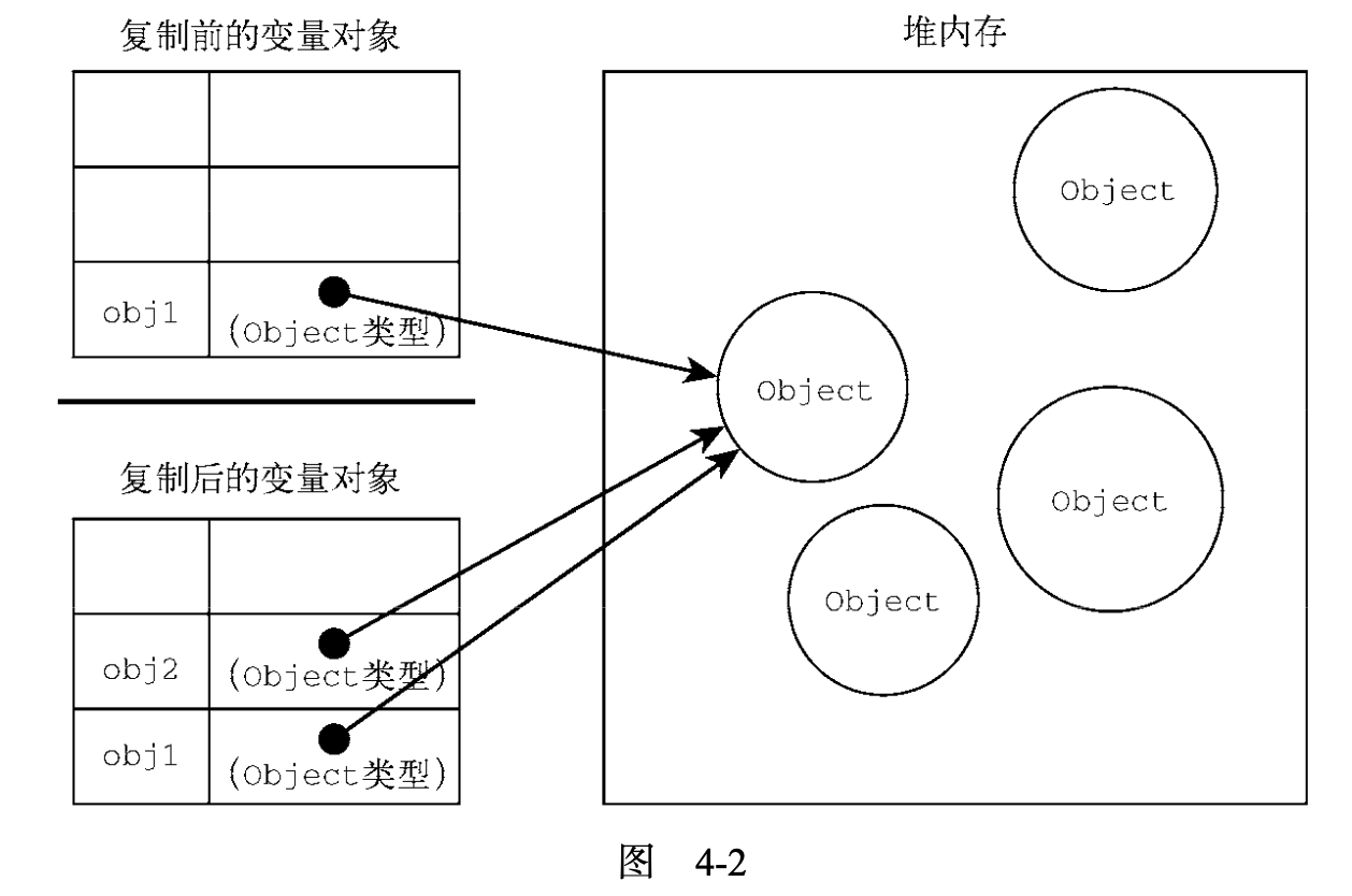 ​ 在这个例子中,变量 obj1 保存了一个新对象的实例。然后,这个值被复制到 obj2,此时两个变量都指向了同一个对象。在给 obj1 创建属性 name 并赋值后,通过 obj2 也可以访问这个属性,因为它们都指向同一个对象。图 4-2 展示了变量与堆内存中对象之间的关系。
